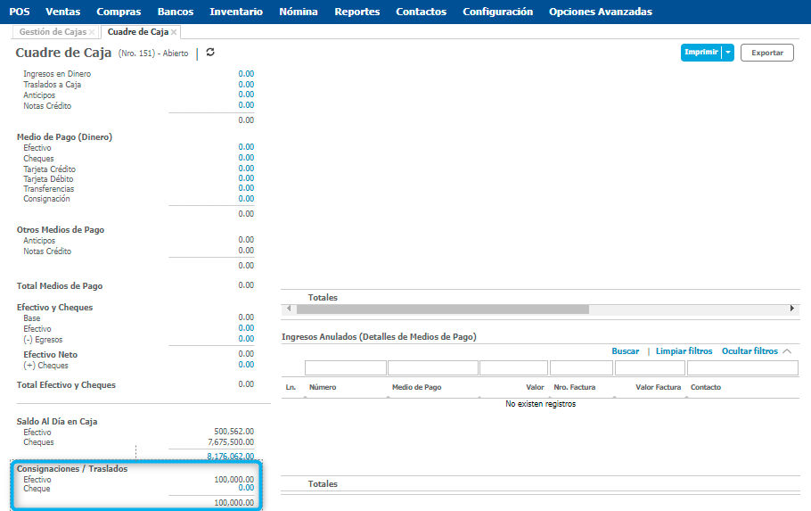 - En la parte inferior izquierda en la sección Consignaciones / Traslados verás el resumen de dicha información.