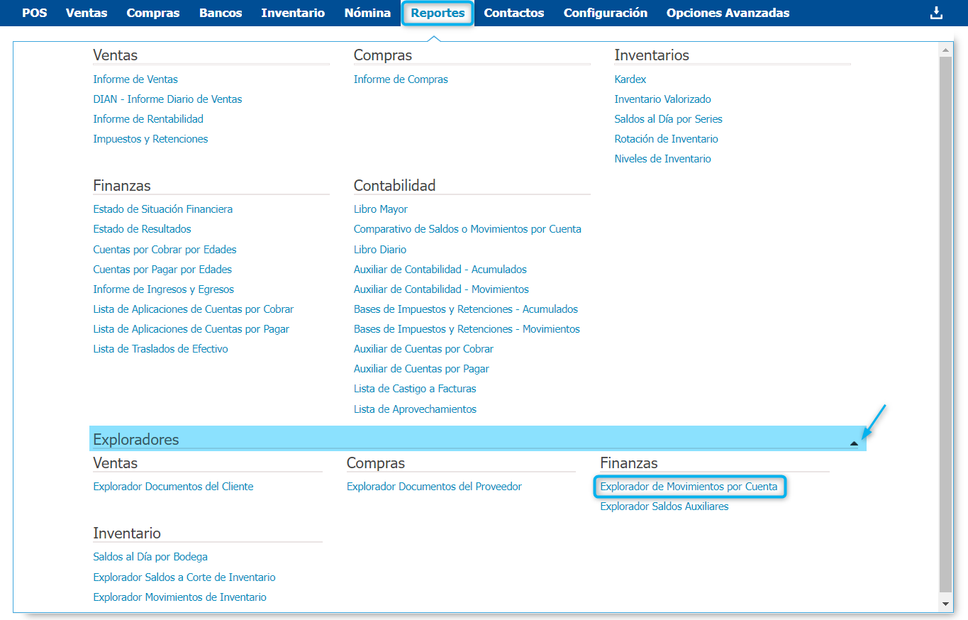 Para acceder a este reporte debes dirigirte a la siguiente ruta Reportes → Exploradores → Explorador de Movimientos por Cuenta.