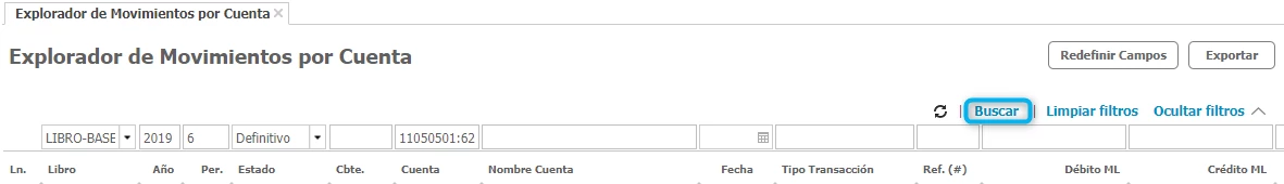 Si deseas consultar los movimientos contables para los filtros establecidos solo debes dar clic en Buscar.