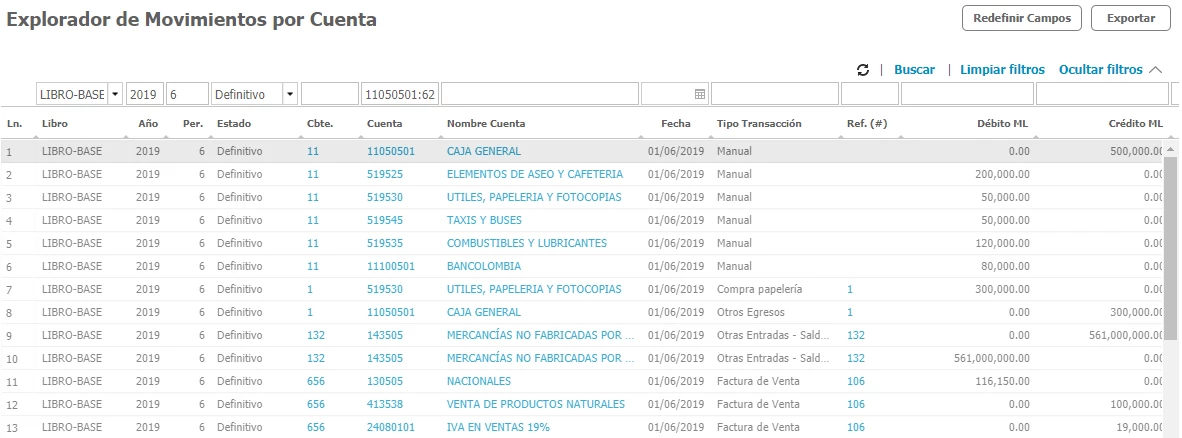 Este reporte muestra los diferentes movimientos que se han realizado, para una o varias cuentas contables dentro de un periodo determinado.