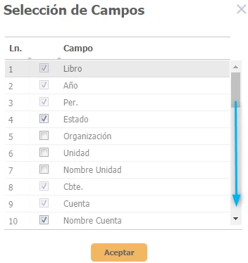Al dar clic allí puedes seleccionar los campos que deseas que se muestren en el reporte. Verifica que los campos que cuentan con la casilla de verificación activa