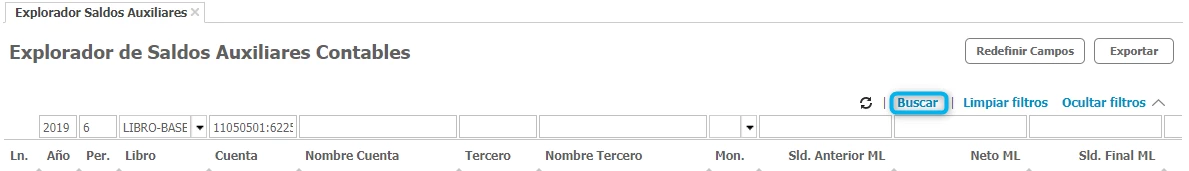 Si deseas consultar los movimientos contables para los filtros establecidos solo debes dar clic en Buscar.