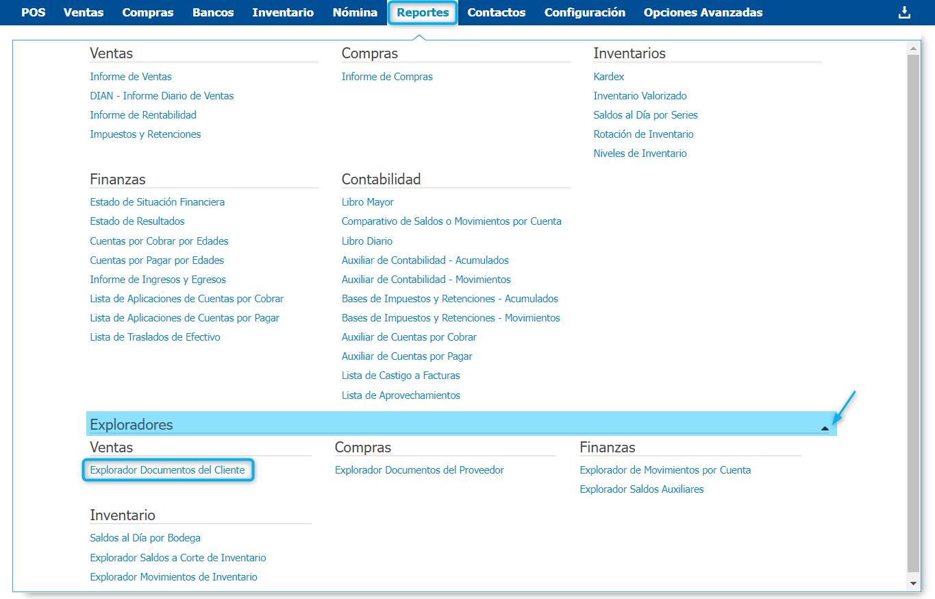 Para acceder a este reporte ingresa en la siguiente ruta Reportes → Exploradores → Explorador Documentos del Cliente.