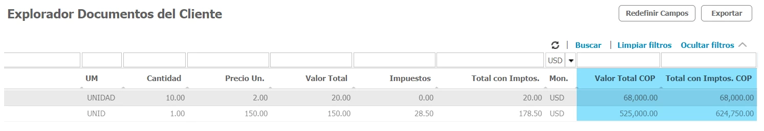 - Total con Impuestos COP: El sistema te muestra también el cálculo de las ventas en moneda local (COP) incluyendo los impuestos.