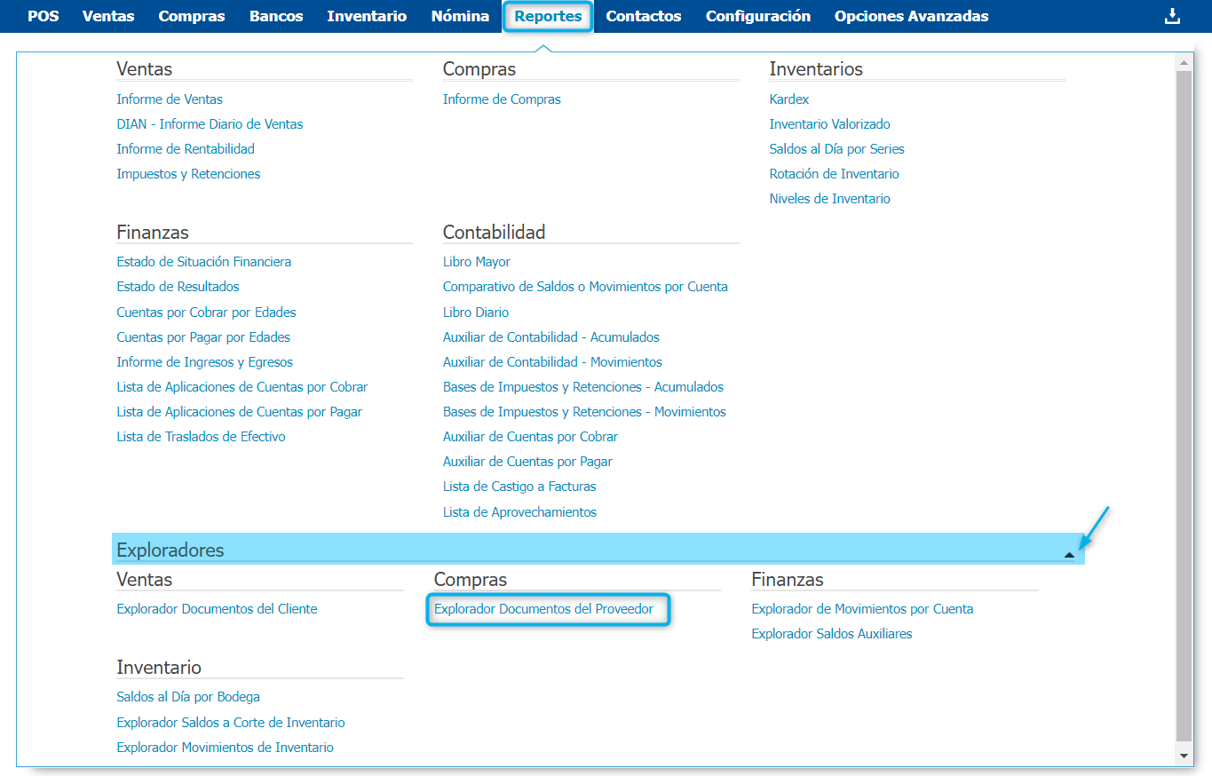 Para acceder a este reporte debes dar clic en la ruta Reportes → Exploradores → Explorador Documentos del Proveedor.