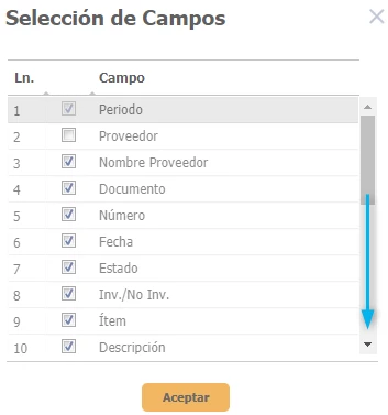 Al dar clic allí puedes seleccionar los campos que deseas que se muestren en el reporte. Verifica que los campos que cuentan con la casilla de verificación activa