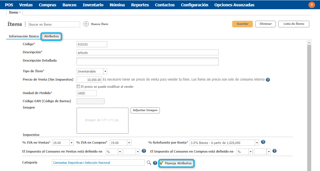 - La categoría Maneja Atributos Inventariables: Los atributos te permiten agrupar ítems por características relevantes al momento de la venta. Por ejemplo, si vendes camisas, un atributo relevante puede ser "Color", otro puede ser "Talla".