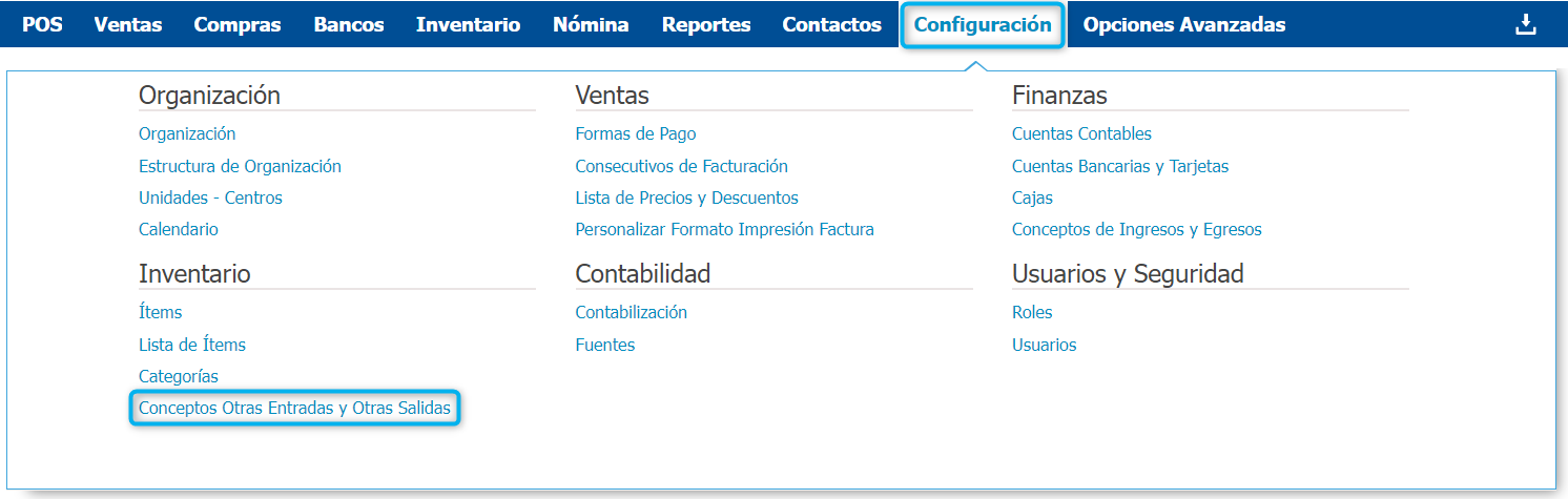 Si necesitas crear un concepto de entrada o salida de inventario puedes realizarlo por Configuración → Inventario → Conceptos Otras Entradas y Otras Salidas.