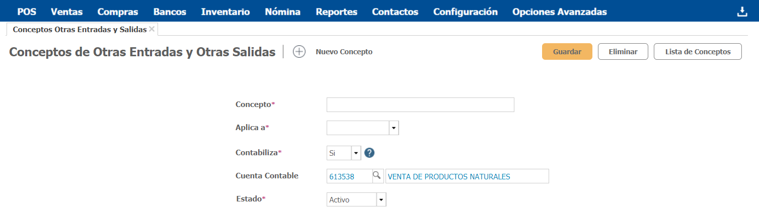 - Concepto: Ingresa el nombre del concepto de entrada o salida que deseas crear. En este puedes indicar con alguna palabra clave la utilidad o fin del concepto