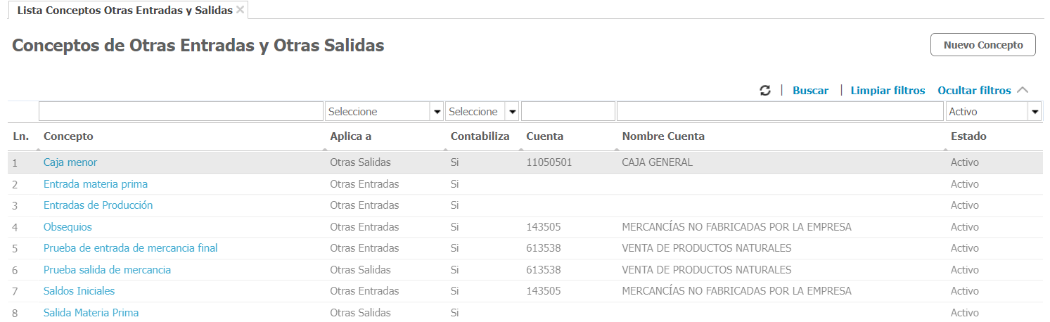 Al hacer esto podrás visualizar todos los conceptos de otras entradas y otras salidas creados en el sistema con su información principal, incluyendo si estos contabilizan o no.
