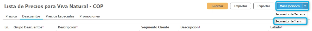 Para realizar la creación de un nuevo segmentos de ítems, ingresa a Configuración → Lista de Precios y Descuentos, y desde la pestaña de Descuentos, Precios Especiales o Promociones das clic en el botón Más Opciones → Segmentos de Ítems.