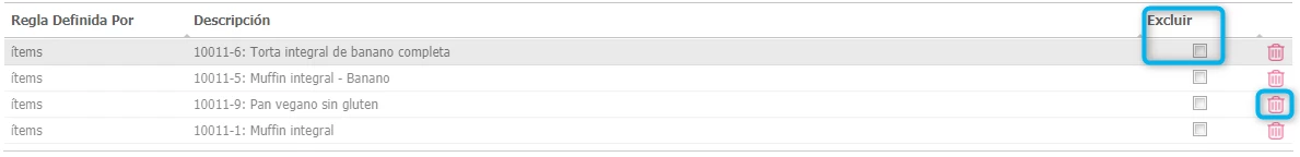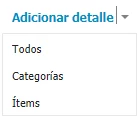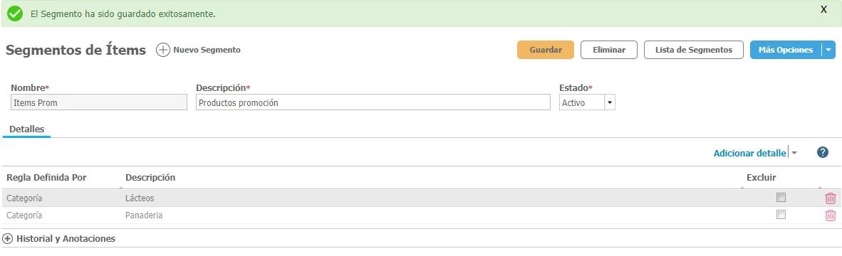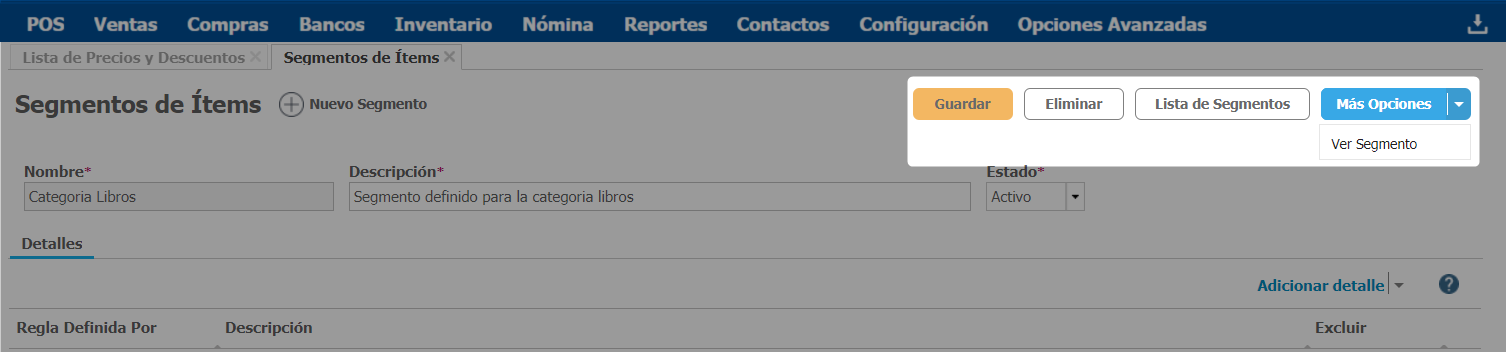 Para adicionar reglas para los segmentos de ítems siempre debe hacer uso de la opción Adicionar detalle, seleccione una de las posibles reglas y esta será visible como detalle del segmento.