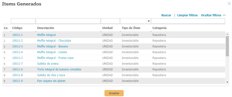 La opción de Categorías te muestra las categorías de productos que tienes creadas en el sistema, solo debes seleccionar las que deseas incluir en el nuevo segmento de ítems y dar clic en Aceptar.