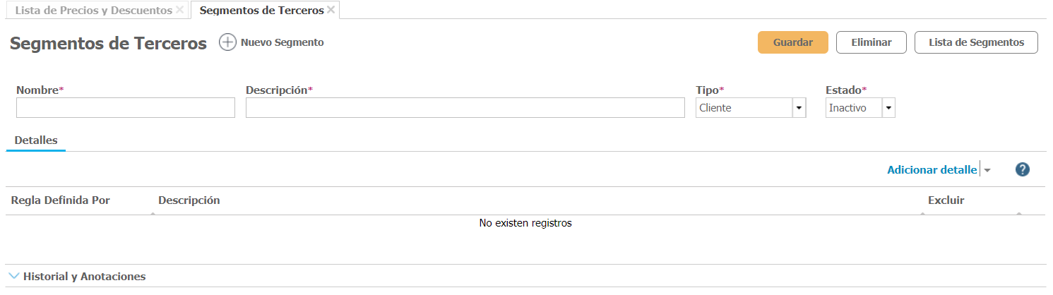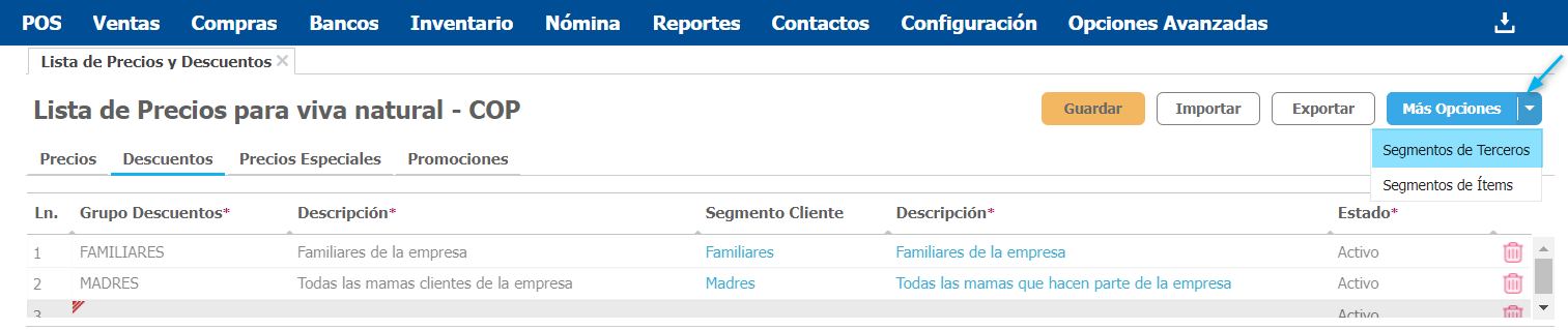 El sistema te permite crear los segmentos o grupos de terceros para aplicar descuentos y visualizar las listas de terceros que tienes configuradas en el sistema.