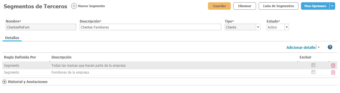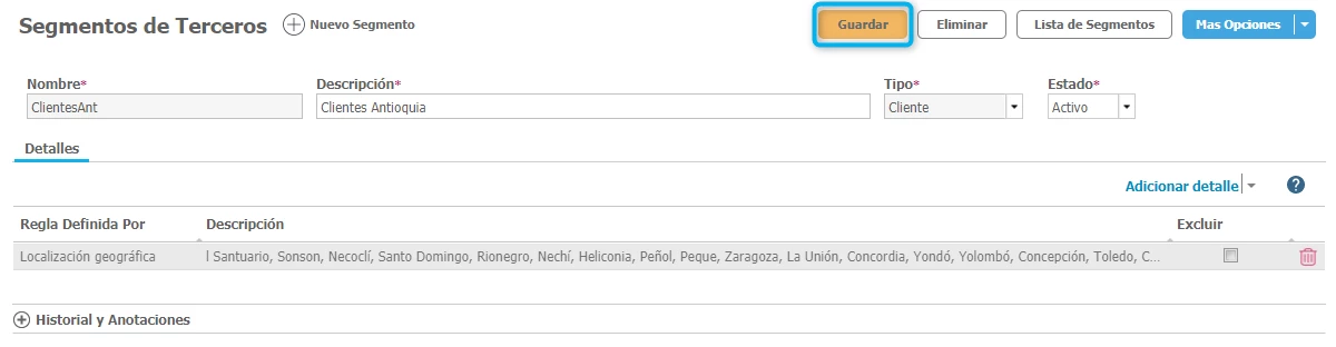 Al dar clic en Acepta, el sistema te muestra como quedó la configuración final del segmento de terceros, si deseas puedes agregar otro tipo de detalle y para finalizar das clic en el botón Guardar.