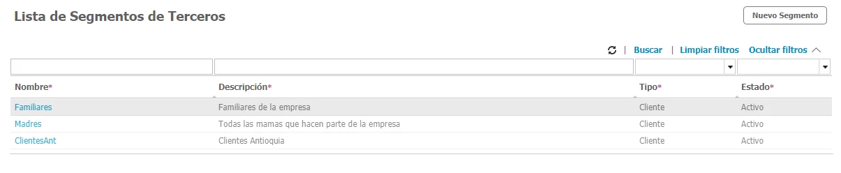 Al dar clic en la opción Todos, el sistema creará automáticamente un segmento con todos los terceros que tengas creados en la compañía.