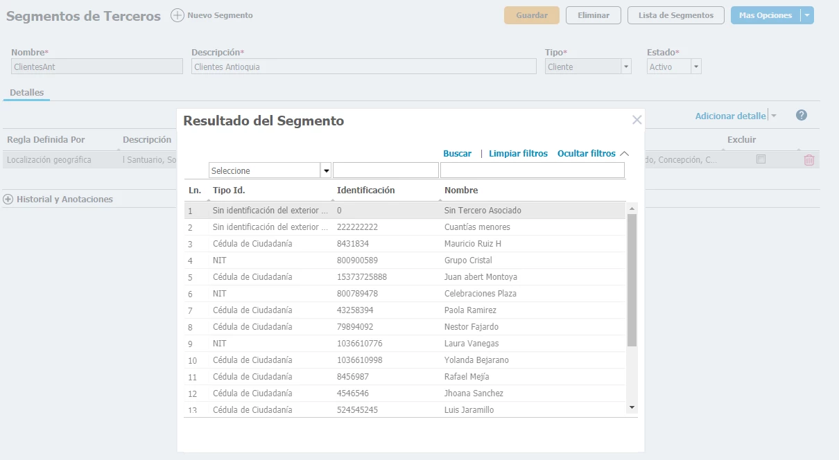 Al dar clic en esta este campo se abre una nueva ventana especificando los terceros que hacen parte del segmento especifico, como se muestra en el siguiente ejemplo: