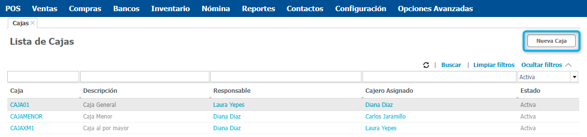- Por la ruta Configuración → Cajas. En la nueva pestaña das clic en el botón Nueva Caja.