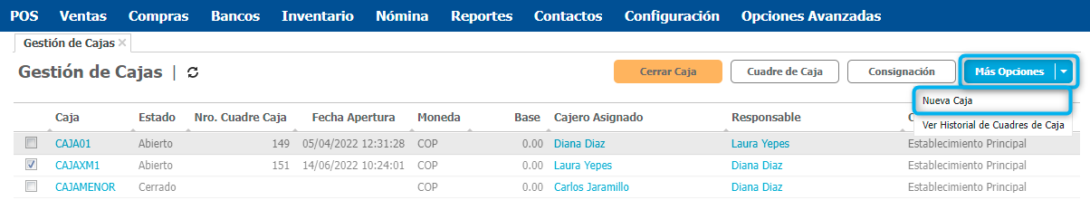 - Otra opción es por la ruta POS → Gestión de Cajas en esta pestaña da clic en el botón Más Opciones → Nueva Caja.