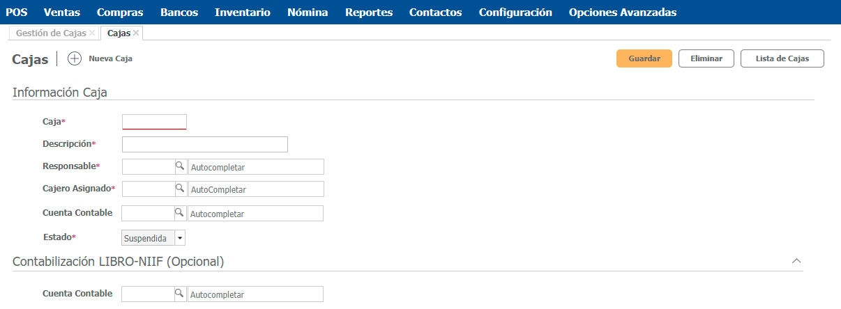 En la pestaña Cajas debes diligenciar todos los campos marcados con un asterisco rojo ( * )