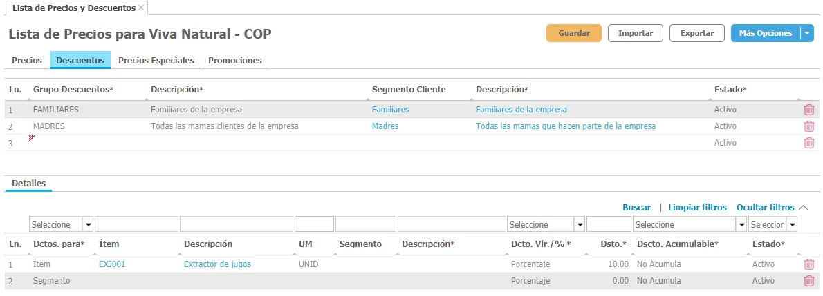 En la pestaña de Descuentos vas a poder definir de una manera detallada valores y disminuciones específicas para algunos ítems establecidos para grupos de clientes.