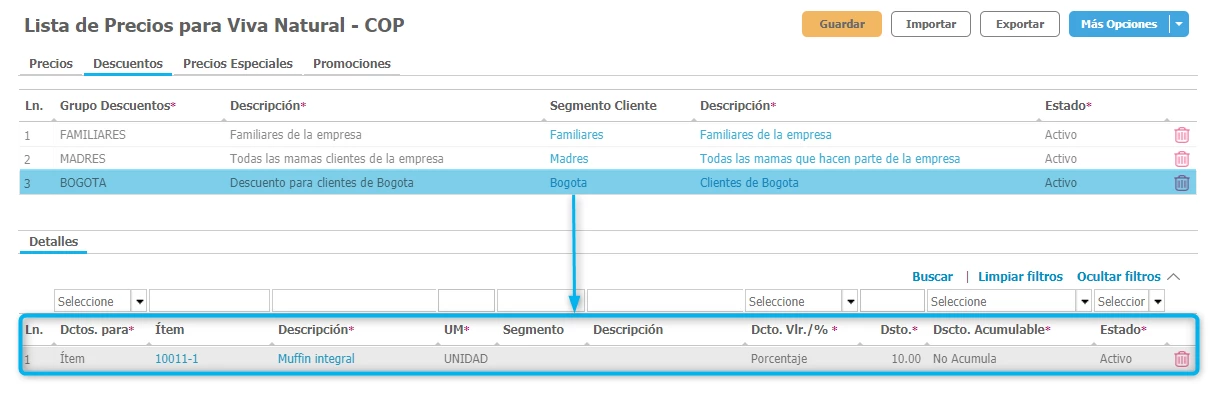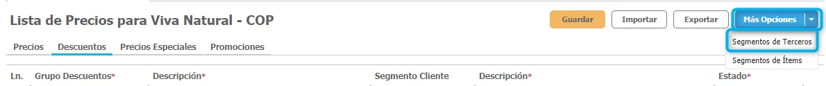 En la parte superior de la ventana puedes identificar los Grupos de Descuentos ya creados con su respectiva Descripción, el Segmento de Clientes al cual aplica y el Estado del Descuento (activo o inactivo, el descuento se aplicaría si se encuentra activo).