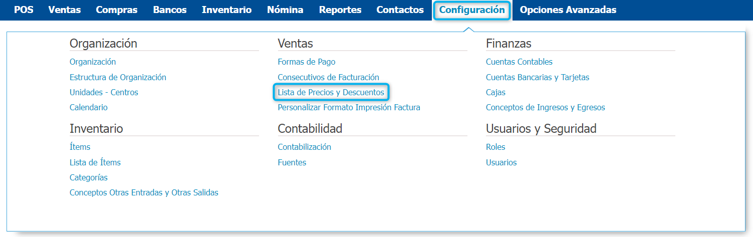 Para ingresar a la ventana de descuentos debes dirigirte a Configuración → Lista de Precios y Descuentos