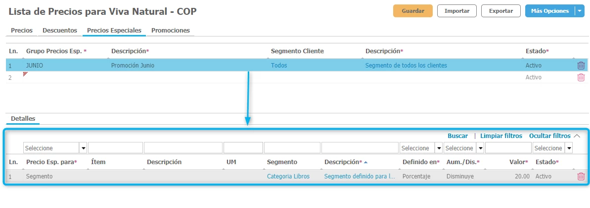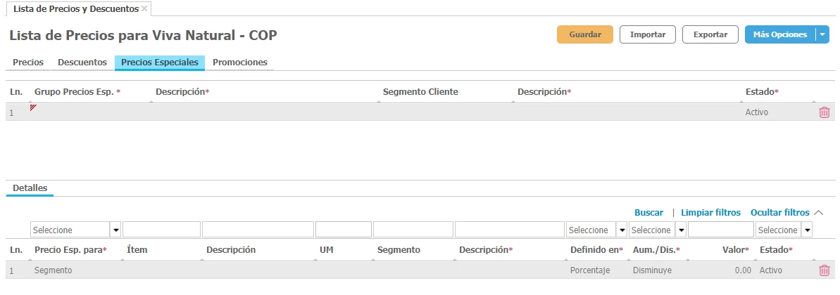 Diligencia toda la información requerida en la sección superior y luego continuas con los Detalles para especificar a que ítems o segmento de ítems aplican estos precios especiales.