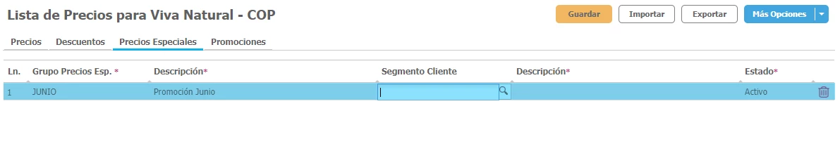 Los precios especiales son listas de precios en las que puedes usar valores superiores o inferiores a los valores encontrados en la lista de precios base o principal.