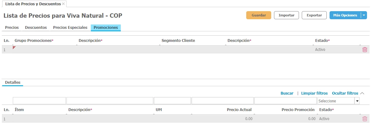 Luego que tengas diligenciada la información principal debes indicar el Detalle para esta promoción que estas configurando.