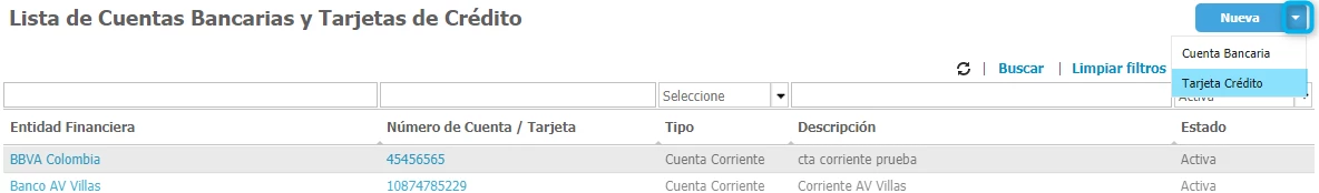 Si deseas crear una nueva tarjeta crédito, desde la opción de Configuración → Cuentas Bancarias y Tarjetas debes dar clic en el botón Nueva y seleccionar tarjeta de crédito.