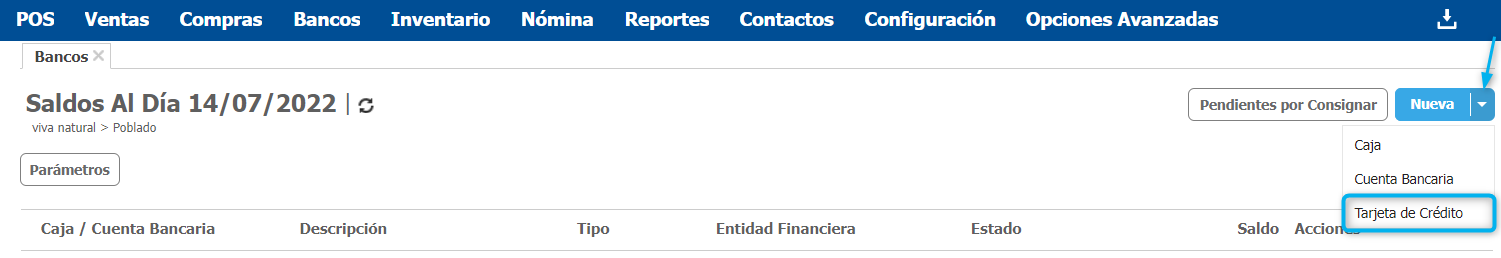 También puedes ingresar desde el módulo de Bancos, dando clic en Nueva → Tarjeta de Crédito.