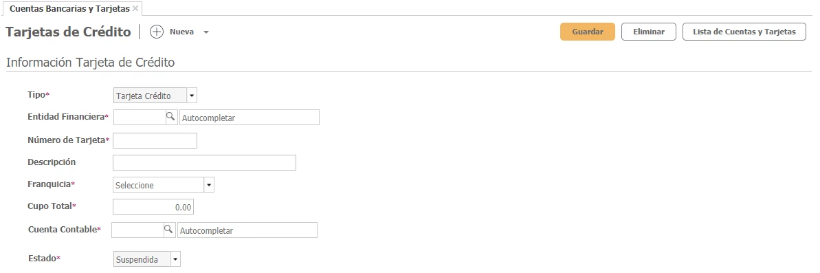 Si dejas este campo en blanco y guardas la información la tarjeta de crédito quedará en estado Suspendida y no puedes registrar movimientos de la misma en la aplicación. Si tienes inquietud en la cuenta contable puedes solicitar a tu contador que te indique cual corresponde, al diligenciar el campo y guardar los cambios la tarjeta de crédito quedará activa. - Estado*: Indica el estado de la tarjeta de crédito, al estar Activa puedes hacer uso de esta en movimientos de la aplicación. Si la tarjeta de crédito registra Suspendida o Retirada no será visible para registrar transacciones con ella.