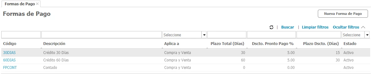- Ingresa el Código mediante el cual identificarás la forma de pago en el sistema (Ejemplo: 30DIAS)