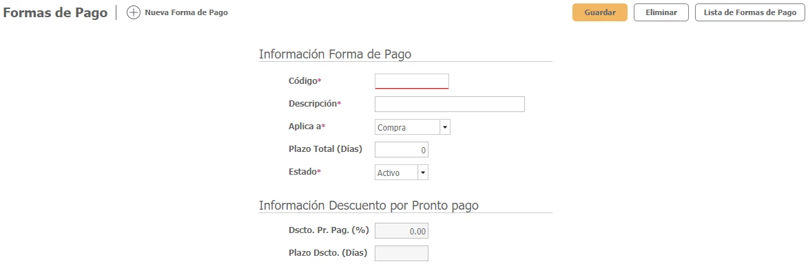 - En caso que la forma de pago ofrezca un plazo en días, indícalo en el campo Plazo Total (Días) (Ejemplo: en el caso de ser un pago a 30 días indicarías 30 en este campo)