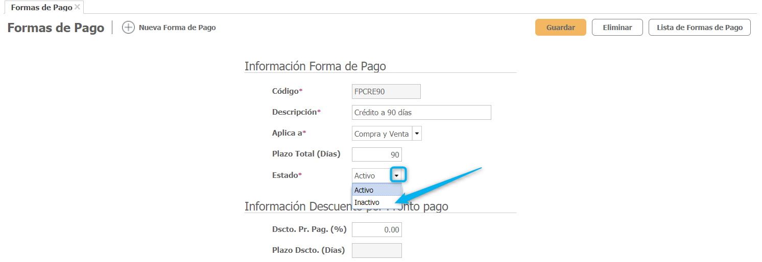 El estado podrá ser modificado posteriormente a Inactivo, en caso que ya no requieras hacer más uso de esta. Para esto debes ingresar a la configuración de la forma de pago y desplegar el menú de Estado.