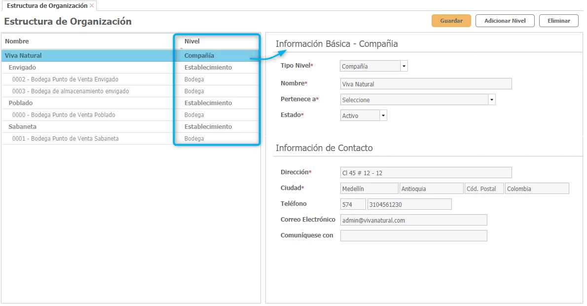 - En la parte izquierda puedes verificar el nombre y nivel de cada uno de los componentes de la organización, puedes identificar si la información es de la compañía, un establecimiento o una bodega.