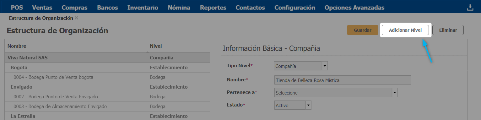 Para crear una nueva bodega debes ingresar a Configuración → Estructura de Organización y dar clic en el botón Adicional Nivel que encuentras en la parte superior derecha de la ventana.