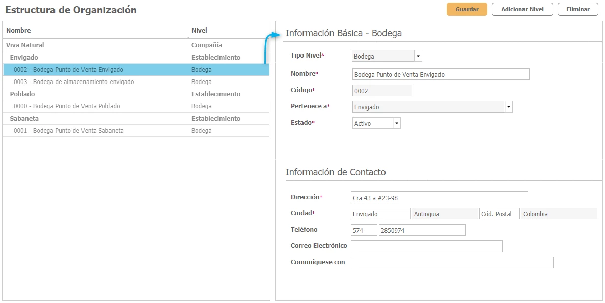 Para modificar la información de una bodega, desde la opción Configuración → Estructura de Organización selecciona en el árbol (o menú por niveles) ubicado a tu izquierda, la bodega que deseas modificar. El sistema recupera la información correspondiente a dicha bodega.