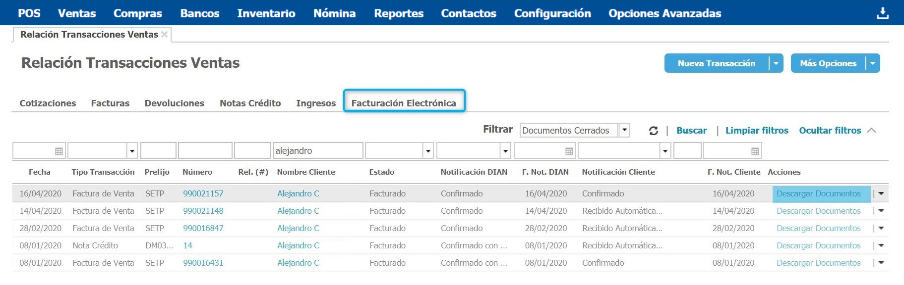 Este proceso lo realizas por Ventas → Relación de Transacciones Ventas → Pestaña de Facturación Electrónica.