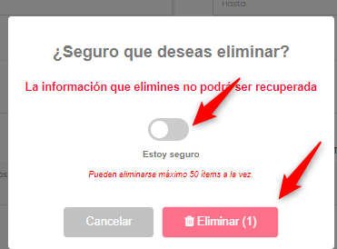 - Solo pueden eliminarse máximo 50 registros a la vez.