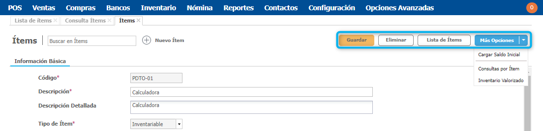 Si el ítem ya esta creado en el sistema pero estas verificando su información, en la parte superior de la ventana puedes visualizar las opciones: