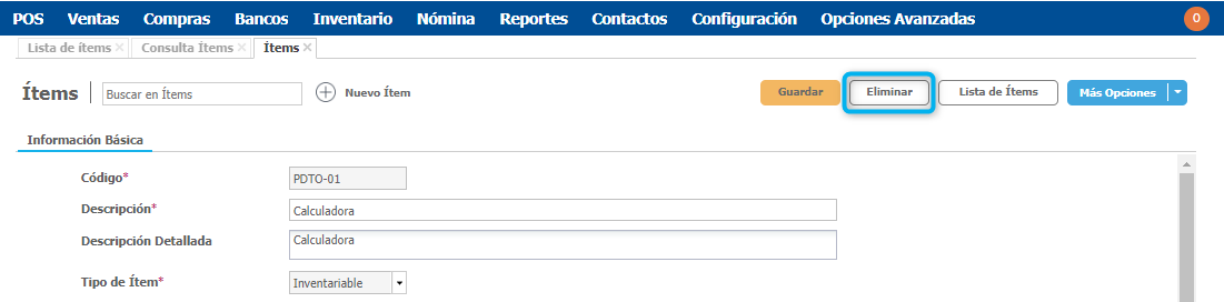 - Eliminar: Con este botón podrás eliminar el ítem que estas consultando, siempre y cuando este no tenga movimientos en el sistema.