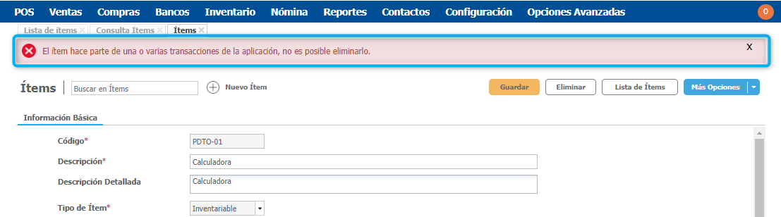 Si el ítem tiene movimientos asociados el sistema no permite eliminarlo y te mostrará un mensaje como el siguiente: