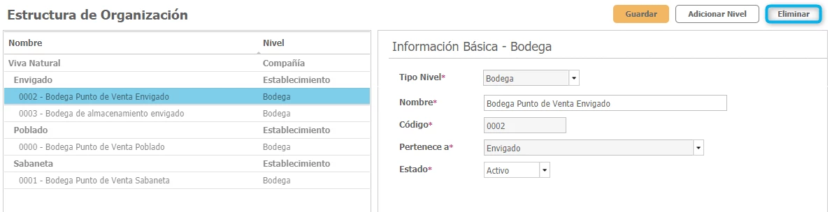 Para esto solo debes ingresar a Configuración → Estructura de Organización, allí seleccionas el establecimiento o bodega que desees quitar de tu compañía y dar clic en el botón Eliminar de la parte superior derecha.