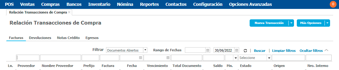 De forma predeterminada el sistema te muestra la información de las facturas de compra y puedes seleccionar diferentes filtros para realizar la consulta.