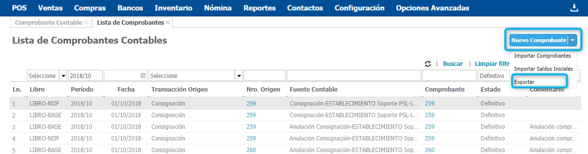Cómo exportar la lista de comprobantes contables registrados en Loggro Pymes