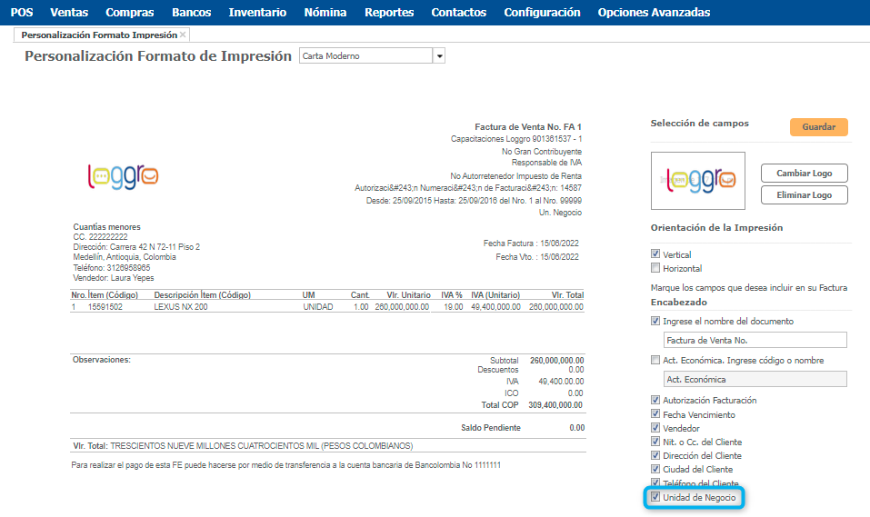 Nota: Recuerda desde la personalización del formato de impresión activar el campo de Unidad para que al imprimir el documento sea visible la información. Ingresa por la ruta Configuración → Personalizar Formato Impresión Factura