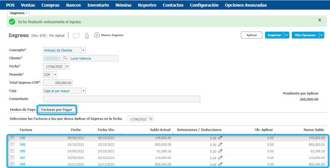 2. Convertir un Ingreso de dinero por concepto de Pago de Clientes en Anticipo