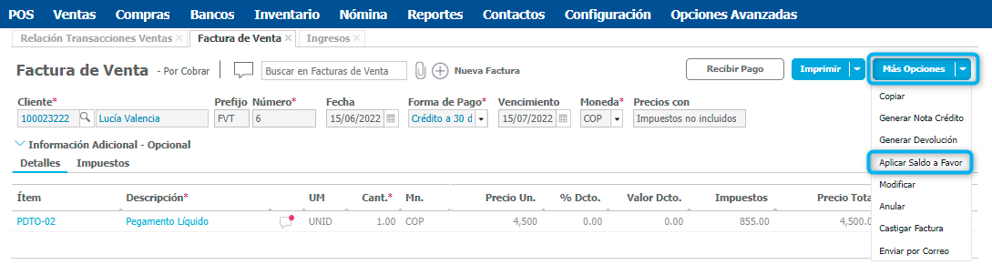 o dando clic en Más Opciones → Aplicar Saldo a Favor.